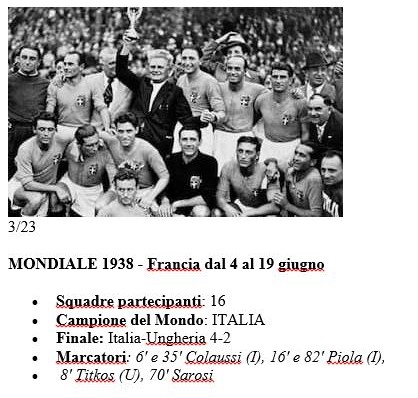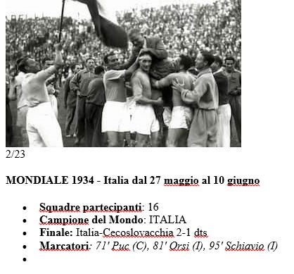 Nato nel 1930 da un idea del francese Jules Rimet, Il campionato mondiale di calcio è il più prestigioso trofeo delle rappresentative nazionale di calcio del mondo. Il torneo è organizzato dalla FIFA. La partita finale del torneo è l'evento più seguito tra tutti gli eventi sportivi nel mondo. Le edizioni sono state vinte in totale da 8 nazionali: Brasile (5 volte), Italia e Germania (4 volte, di cui le prime 3 come Germania Ovest), Argentina (3 volte), Uruguay e Francia (2 volte), Inghilterra e Spagna (1 volta). L'Italia fu tra le due finaliste per 6 volte, Fu campione del mondo per 4 volte, nel 1934, 1938, 1982, e 2006. Le altre due volte perse in finale contro il Brasile : in Messico nel 1970, in tempi regolari, e in Pasedina, Caliafornia nel 1994 ai rigori per tiro che finì sulla traversa. Con le sue quattro stelle che sono segnanta sulla maglia azzurra, l'Italia fa parte delle GRANDI nella storia del mondo calcistico mondiale. Ogni coppa mondiale ha la sua storia, i suoi drammi e le sue gioie. Nel 1934 l'Italia non era forse la squadra più technicamente superiore, ma riuscì a spuntarla grazie al fattore campo di casa. Il torneo si svolse in Italia. La squadra con una piccola spinta arbitrale, si aggidicò sotto gli occhi severi di Mussolini il suo primo mondiale. Nel 1938, l'allenataro Pozzo che aveva già finto l'edizione precedente, si presentò alla competizione in Francia con un'Italia che dimostrò di essere la migliore compagine in campo, vinse di nuovo il torneo. La seonda guerra mondiale pose un temine alle competizioni internazionali. Nel 1949, il calcio italiano subì una tragedia. Un incidente aerio distrusse la squadra del Torino che era il Club che a quei tempi forniva 10 degli undici giocatori alla nazionale. Negli anni 60'e 70', l'Italia salì di nuovo nella rosa delle migliori compaggine calcistiche. Tuttavia, gli azzurri dovettero attendere al 1982 per trovare il loro terzo titolo mondiale in Spagna con la squadra condotta da Bearzot. Infine nel 2006, in Germania, fu la nazionale condotta da Marcello Lippi a riportate l'Italia alla prestigiosa vetta di campione del mondo di calcio.